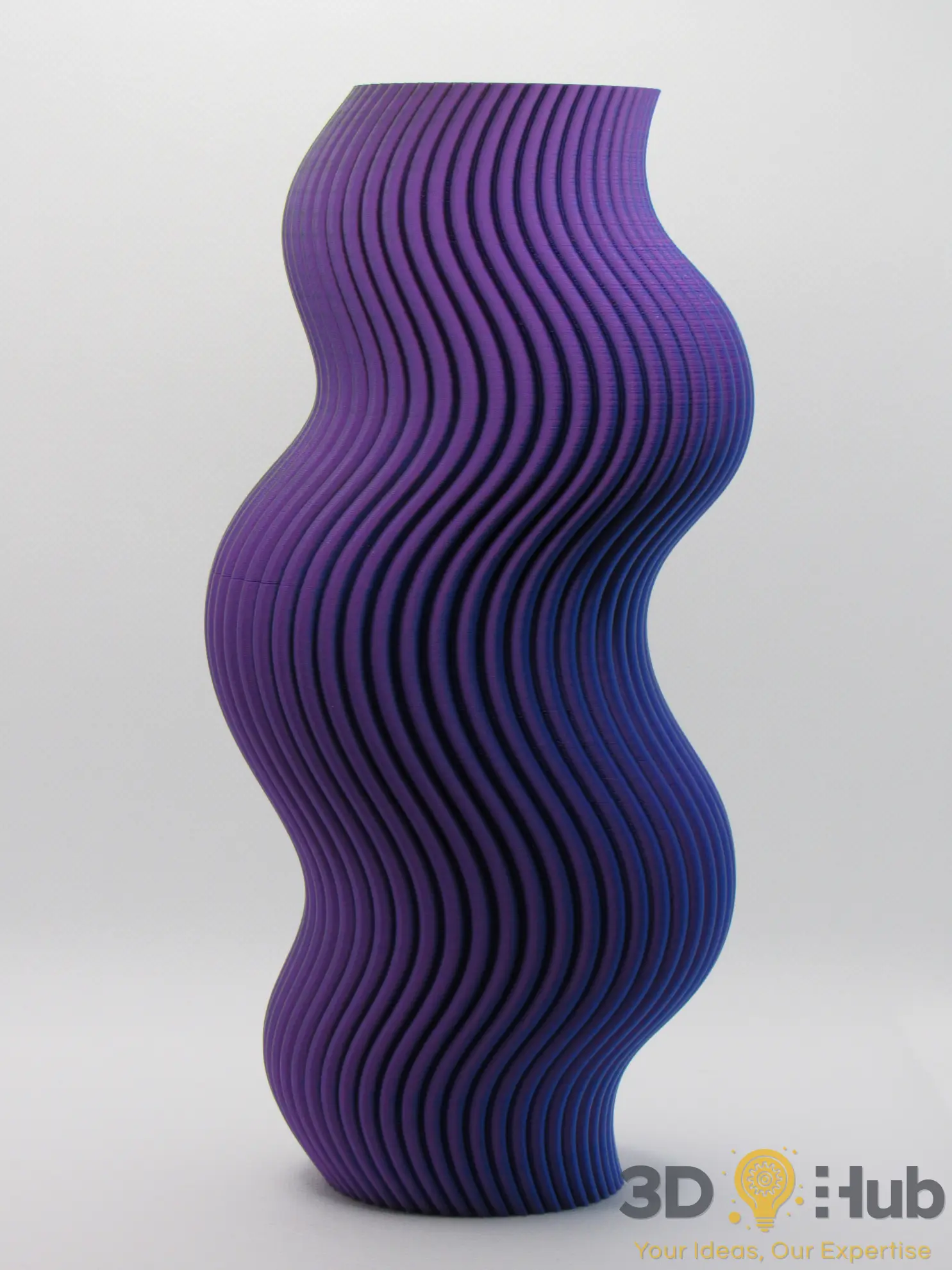 Ця унікальна ваза у формі хвилі захоплює плавними переходами кольорів від фіолетового до синього, які перетікають у насичений чорний. Така гра кольорів додає виробу динамічності та глибини, роблячи його справжнім витвором мистецтва. Ваза стане оригінальною прикрасою будь-якого інтер'єру, додаючи йому нотки елегантності та сучасності.